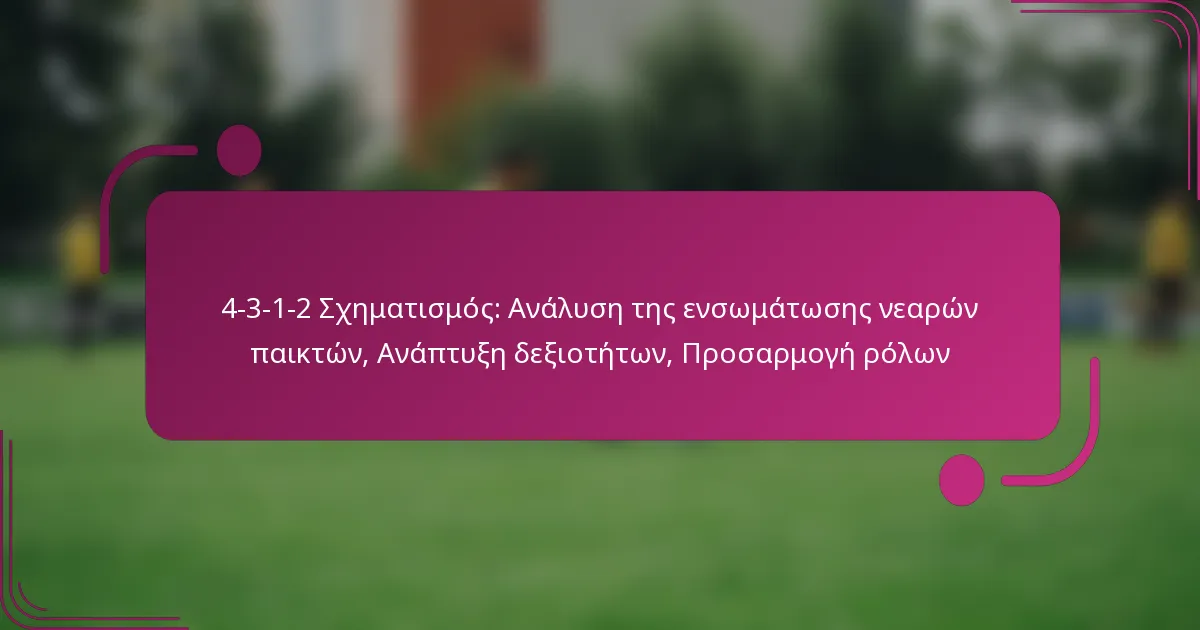 Η διάταξη 4-3-1-2 είναι μια τακτική ρύθμιση στο ποδόσφαιρο που δίνει έμφαση σε μια ισχυρή παρουσία στο κέντρο και σε δύο επιθετικούς, καθιστώντας την ιδανική για νεανικές ομάδες που στοχεύουν στην ενίσχυση της ανάπτυξης δεξιοτήτων και της δυναμικής της ομάδας. Η ενσωμάτωση νεαρών παικτών σε αυτή τη διάταξη απαιτεί σαφείς ορισμούς ρόλων και στρατηγικές κατάλληλες για την ηλικία, διασφαλίζοντας ότι κατανοούν τόσο τις επιθετικές όσο και τις αμυντικές ευθύνες. Καθώς οι παίκτες προσαρμόζονται στις συγκεκριμένες θέσεις τους, πρέπει να καλλιεργήσουν ένα ποικιλόμορφο σύνολο δεξιοτήτων που ισορροπεί την ομαδική εργασία, την τακτική αντίληψη και τις ατομικές ικανότητες.