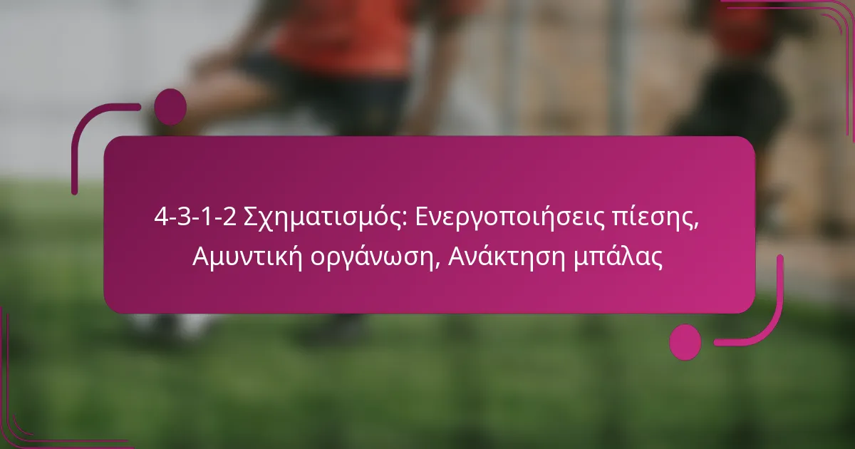 Η διάταξη 4-3-1-2 είναι μια τακτική ρύθμιση στο ποδόσφαιρο που τονίζει μια ισχυρή παρουσία στη μεσαία γραμμή, περιλαμβάνοντας τέσσερις αμυντικούς, τρεις μέσους, έναν επιθετικό μέσο και δύο επιθετικούς. Αυτή η διάταξη προσφέρει όχι μόνο αμυντική σταθερότητα αλλά και επιθετική ευελιξία, καθιστώντας την ιδανική για ομάδες που στοχεύουν στον έλεγχο του παιχνιδιού. Η κατανόηση των ερεθισμάτων πίεσης και η διατήρηση της αμυντικής οργάνωσης είναι απαραίτητες για την αποτελεσματική ανάκτηση της μπάλας και τη μετάβαση μεταξύ επίθεσης και άμυνας.