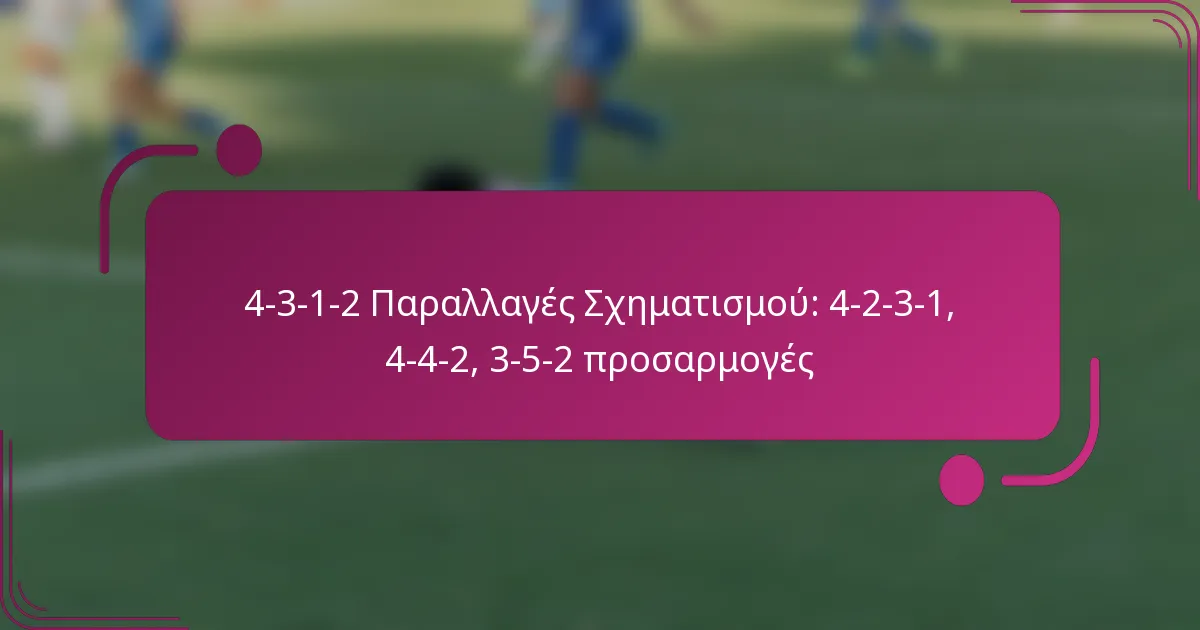 Η διάταξη 4-3-1-2 λειτουργεί ως μια ευέλικτη τακτική ρύθμιση στο ποδόσφαιρο, ισορροπώντας τη defensive δύναμη με τις επιθετικές επιλογές. Παραλλαγές όπως η 4-2-3-1 και η 4-4-2 προσαρμόζουν αυτή τη διάταξη για να ενισχύσουν τον έλεγχο του κέντρου και να παρέχουν περισσότερη επιθετική ευελιξία, ενώ η 3-5-2 προσφέρει μια διαφορετική προσέγγιση χρησιμοποιώντας wing-backs για πλάτος. Κάθε προσαρμογή επιτρέπει στις ομάδες να προσαρμόσουν τις στρατηγικές τους με βάση τις δυνάμεις των παικτών και τις καταστάσεις του αγώνα.