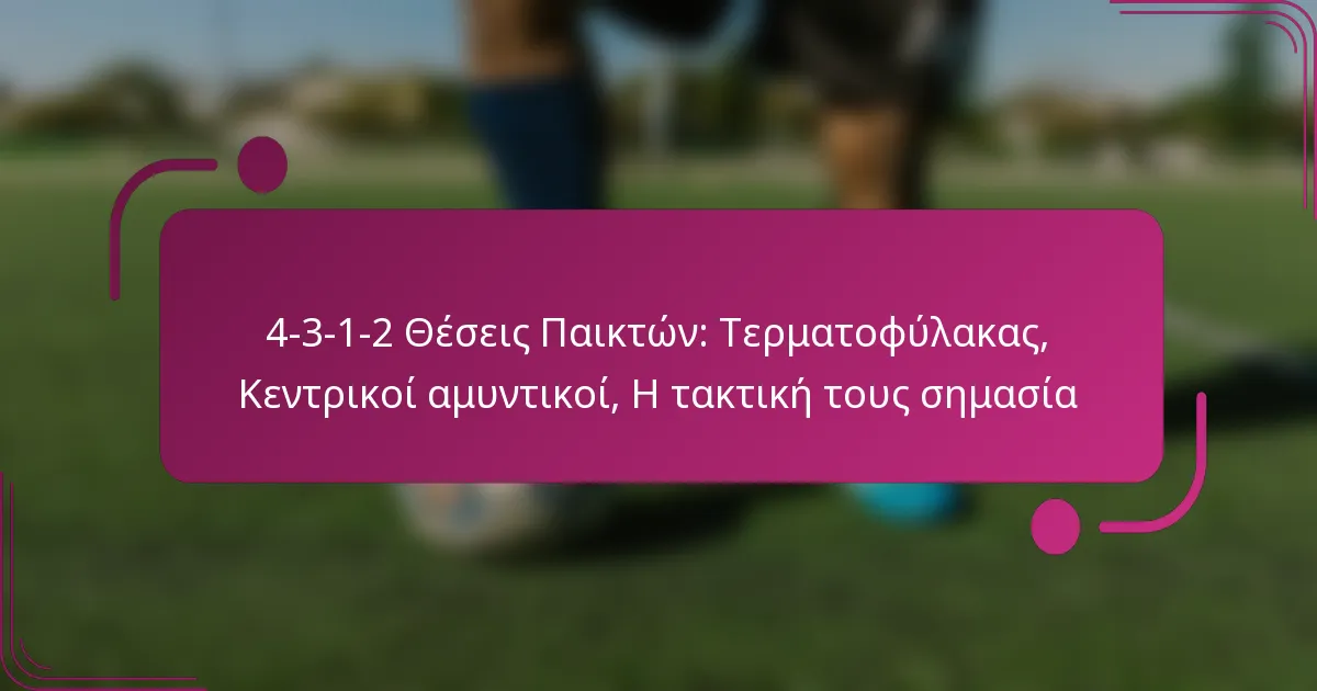 Η διάταξη 4-3-1-2 είναι μια τακτική ρύθμιση στο ποδόσφαιρο που δίνει έμφαση σε μια ισχυρή παρουσία στο κέντρο του γηπέδου, ενώ εξασφαλίζει αμυντική σταθερότητα. Μέσα σε αυτή τη διάταξη, ο τερματοφύλακας είναι καθοριστικός, υπεύθυνος για την αποτροπή των σουτ και την οργάνωση της άμυνας, ενώ οι κεντρικοί αμυντικοί παίζουν κρίσιμο ρόλο στη διατήρηση της αμυντικής ακεραιότητας και στην υποστήριξη των μεταβάσεων προς την επίθεση. Μαζί, αυτές οι θέσεις είναι απαραίτητες για τη συνολική αποτελεσματικότητα της ομάδας.